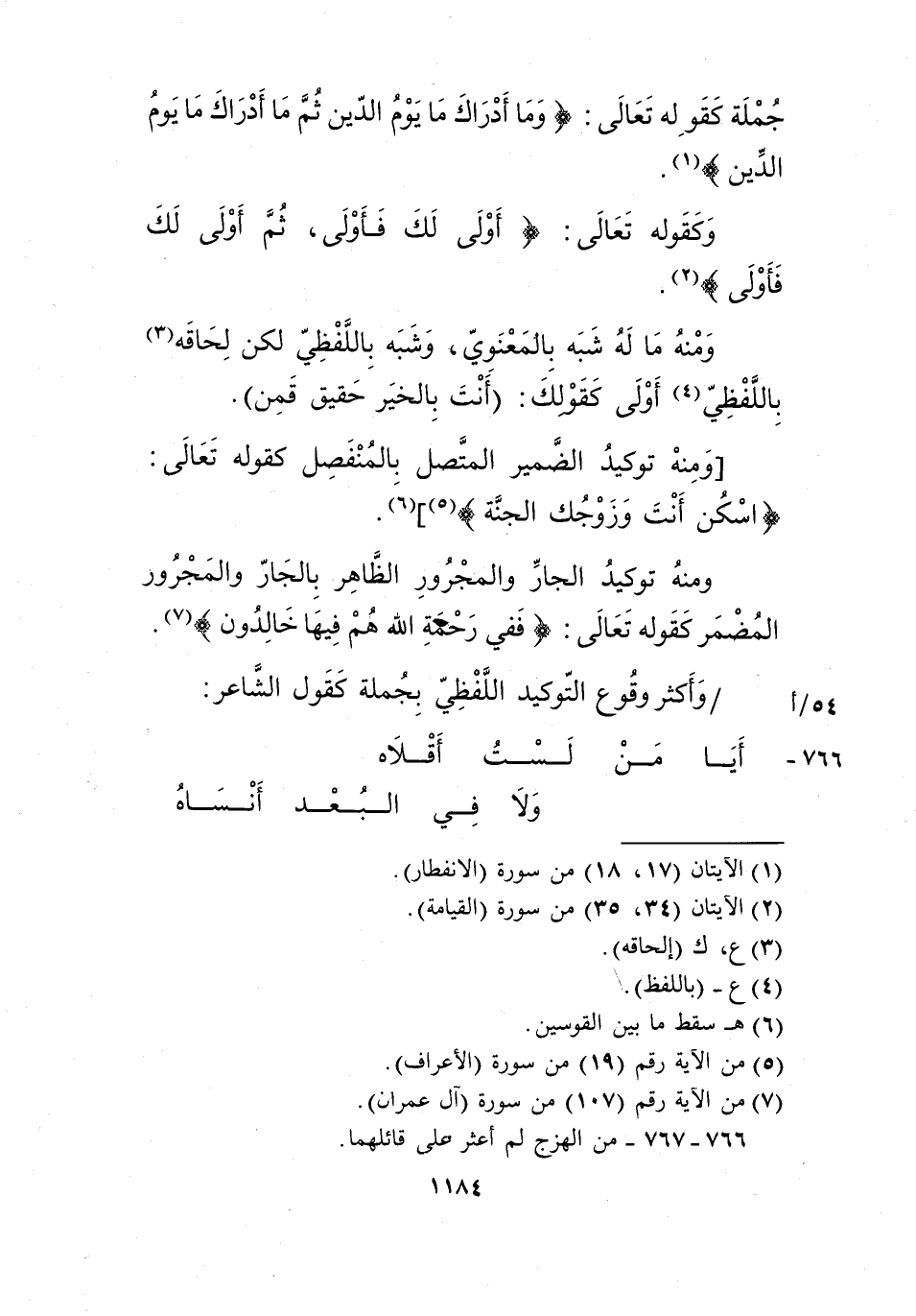 "ومنه توكيد الضمير المتصل بالمنفصل كقوله تعالى: {اسْكُنْ أَنْتَ وَزَوْجُكَ الْجَنَّةَ} 5"6.