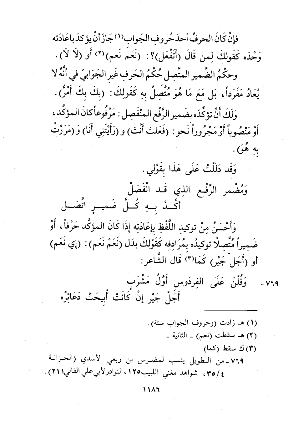وأحسن من توكيده اللفظ بإعادته إذا كان المؤكد حرفا، أو ضميرا متصلا توكيده بمرادفه كقولك بدل "نعم نعم": "أي نعم" أو "أجل جير" كما3 قال الشاعر: