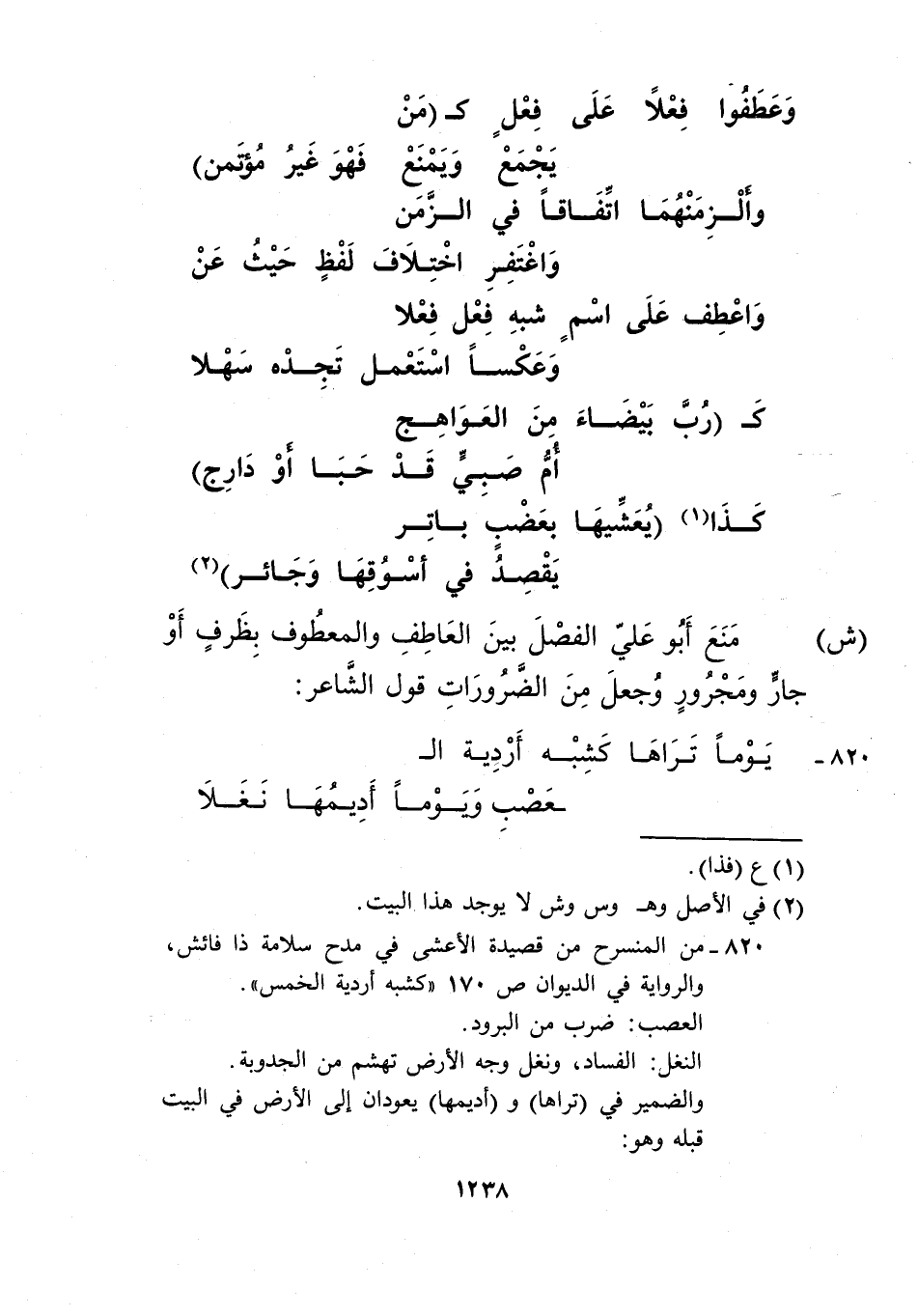 منع أبو علي الفصل بين العاطف والمعطوف بظرف أو جار أو مجرور، وجعل من الضرورات قول الشاعر: