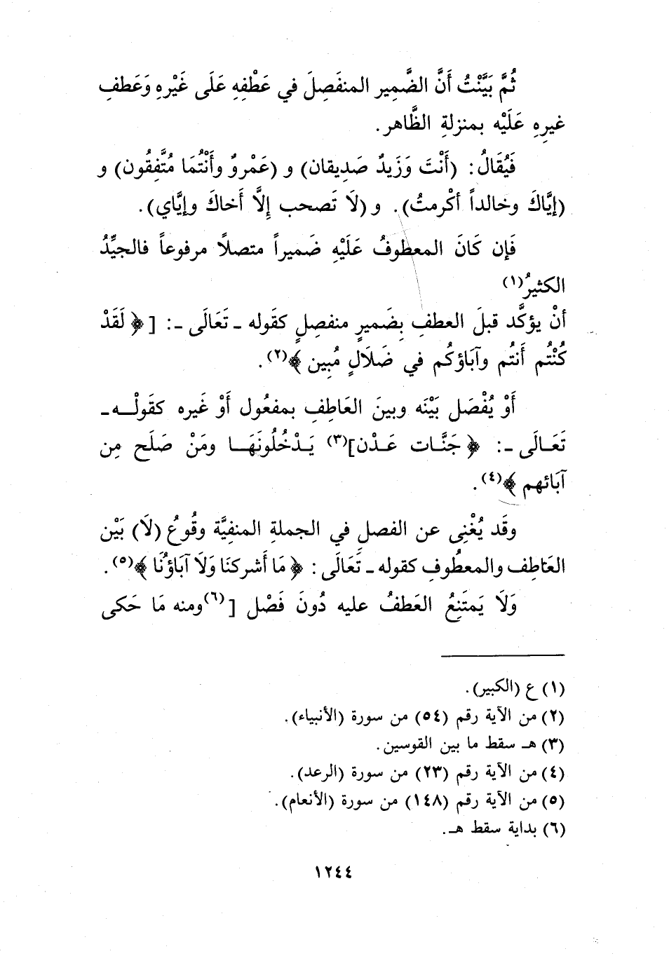 وقد يغني عن الفصل في الجملة المنفية وقوع "لا" بين العاطف والمعطوف كقوله تعالى: {مَا أَشْرَكْنَا وَلا آبَاؤُنَا} 5.