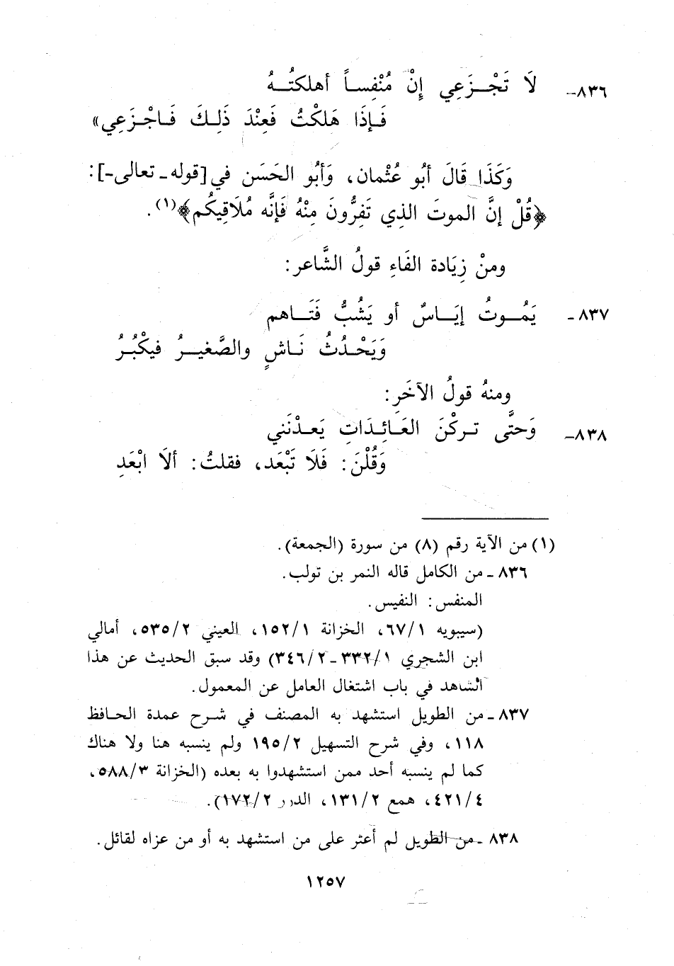 837- من الطويل استشهد به المصنف في شرح عمدة الحافظ 118- وفي شرح التسهيل 2/ 195 ولم ينسبه هنا ولا هناك كما لم ينسبه أحد ممن استشهدنا به بعده "الخزانة 3/ 588، 4/ 421، همع 2/ 131، الدرر 2/ 172".