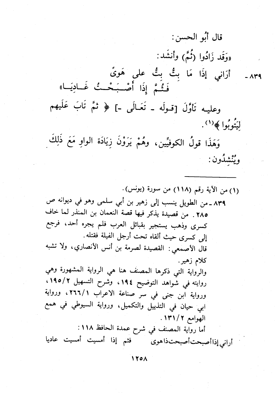 839 - من الطويل ينسب إلى زهير بن أبي سلمى، وهو في ديوانه ص 285، من قصيدة يذكر فيها قصة النعمان بن المنذر لما خاف سرى، وذهب يستجير بقبائل العرب فلم يجره أحد، فرجع إلى كسرى حيث ألقاه تحت أرجل الفيلة فقتله.