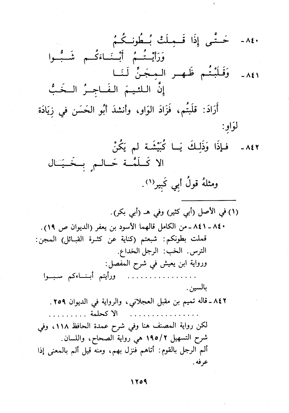 840-841- من الكامل قالهما الأسود بن يعفر "الديوان ص19". قملت بطونكم: شبعتم "كانية عن كثرة القبائل" المجن: الترس. الخب: الرجل الخداع.