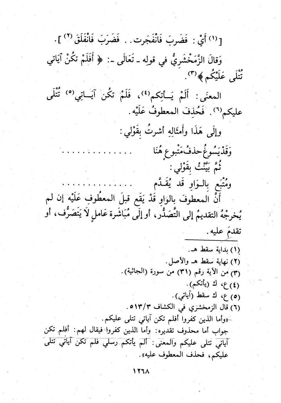 المعنى: ألم يأتكم4، فلم تكن آياتي5 تتلى عليكم6. فحذف المعطوف عليه.