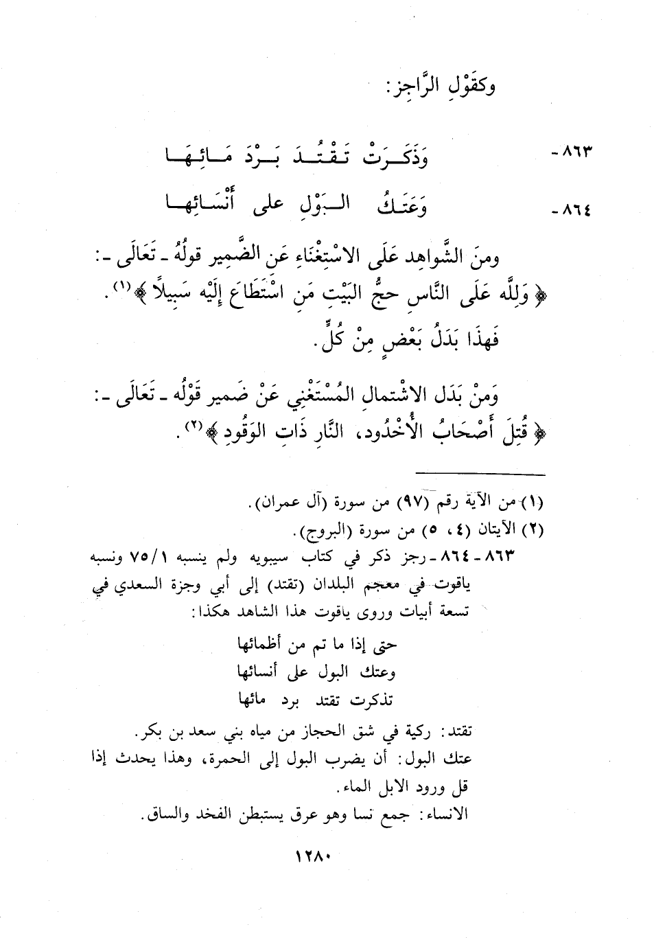863-864- رجز ذكر في كتاب سبيويه، ولم ينسبه 1/ 75 ونسبه ياقوت في معجم البلدان "تقتد" إلى أبي وجزة السعدي في تسعة أبيات، وروى ياقوت هذا الشاهد هكذا: