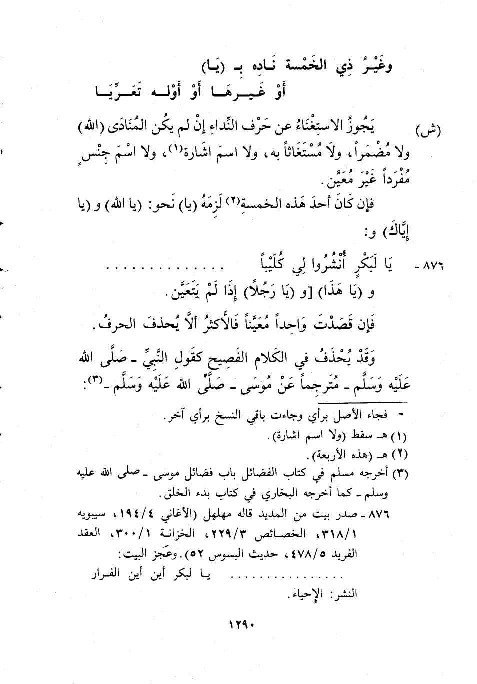 "ش" يجوز الاستغناء عن حروف النداء إن لم يكن المنادى "الله" ولا مضمرا، ولامستغاثا به، ولا سم إشارة1، ولا اسم جنس مفردا غير معين.