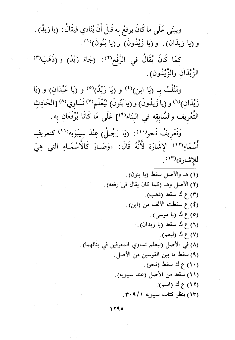 ومثلت بـ"يا ابن"4 و"يا زيد"5 و"يا عبدان" و"يا زيدان"6، و"يا زيدون" ويا بنون" ليعلم7 تساوي 8 [الحادث التعريف والسابقة في البناء9] على ما كانا يرفعان به.