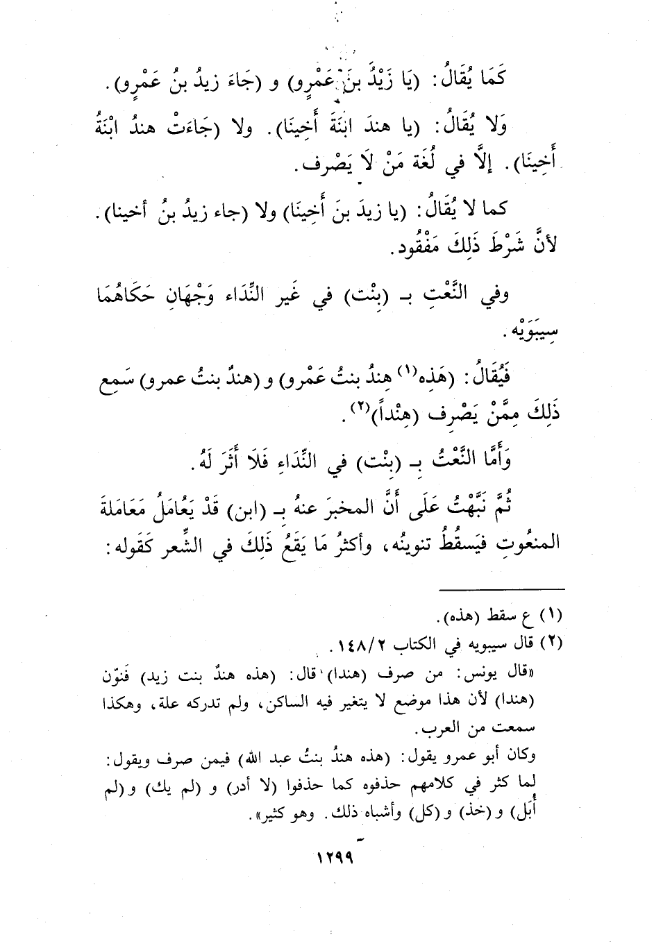 وفي النعت بـ"بنت" في غير النداء وجهان حكاهما سيبويه.