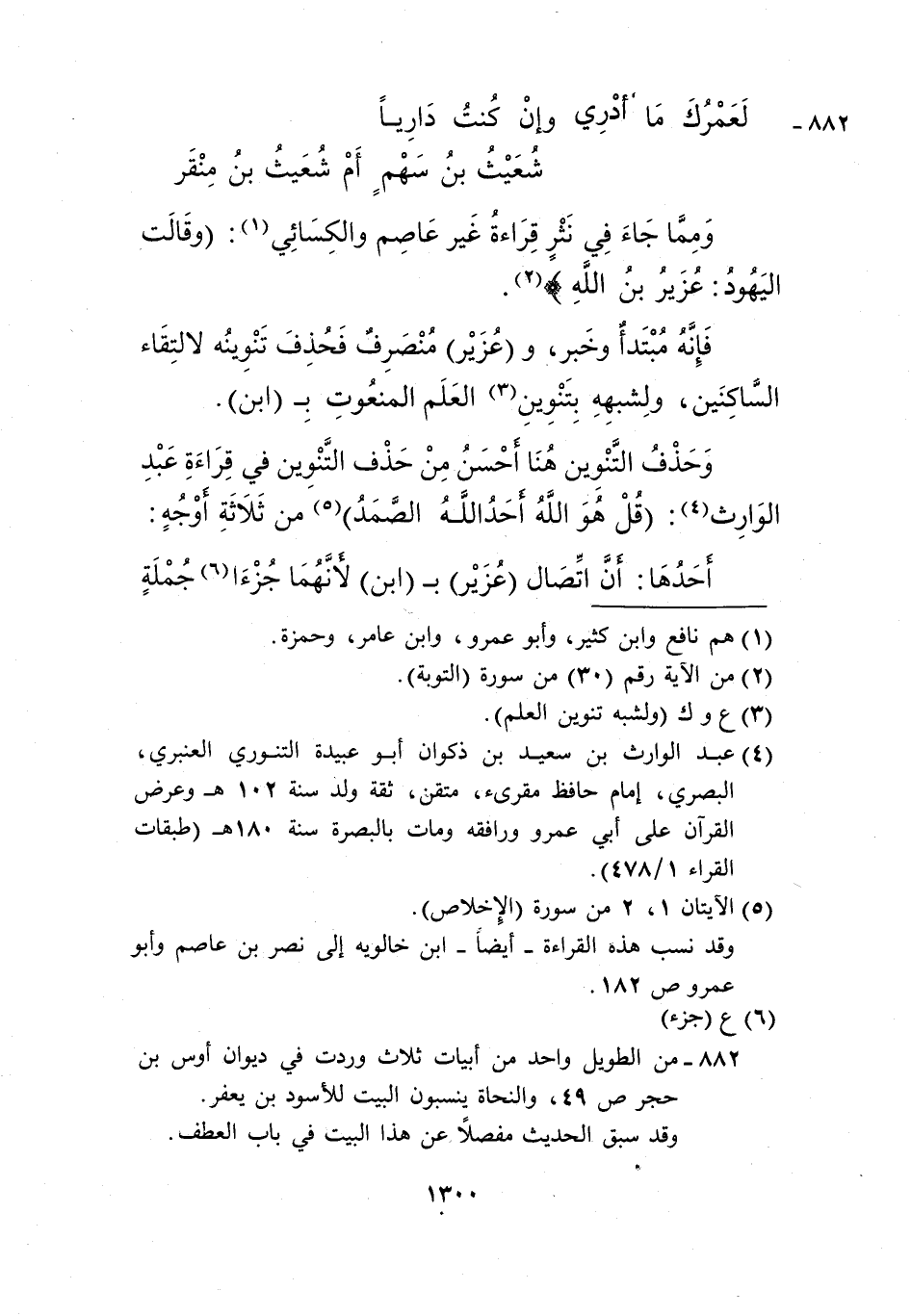 وحذف التنوين هنا أحسن من حذف التنوين في قراءة عبد الوارث4: {قُلْ هُوَ اللَّهُ أَحَدٌ، اللَّهُ الصَّمَدُ} 5 من ثلاثة أوجه: