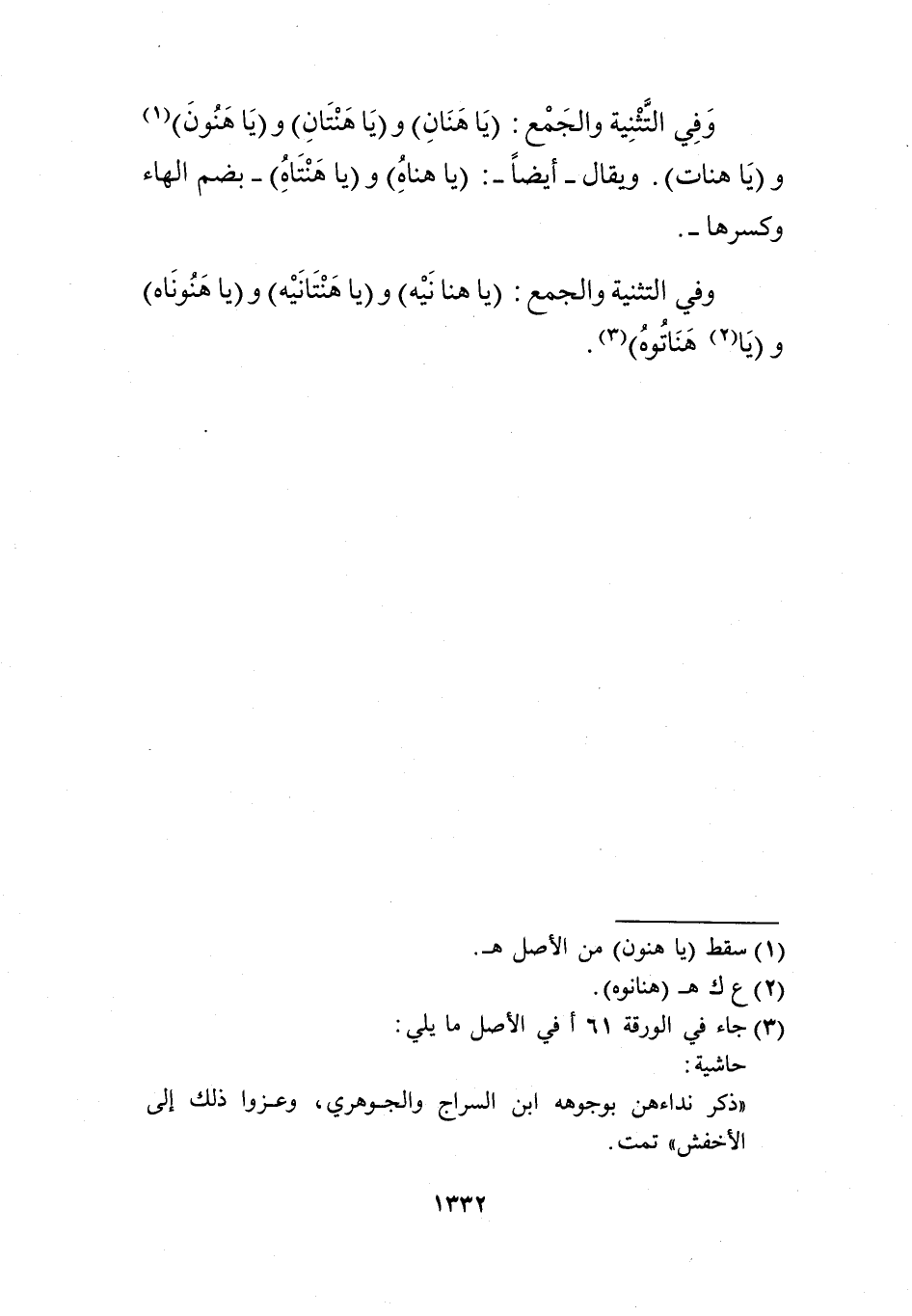 وفي التثنية والجمع: "يا هنان" و"يا هنتان" و"يا هنون"1 و"يا هنات". ويقال -أيضا- "يا هناه" و"يا هنتاه" بضم الهاء وكسرها.