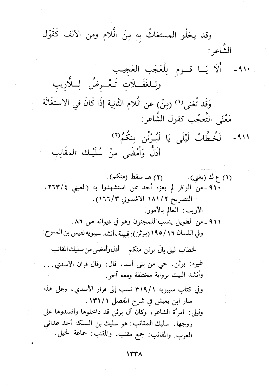 وقد تغني1 "من" عن اللام الثانية إذا كان في الاستغاثة معنى التعجب كقول الشاعر: