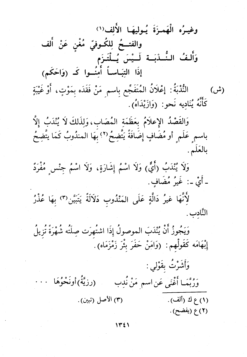 "ش" الندبة: إعلان المتفجع باسم من فقده بموت، أو غيبة كأنه يناديه نحو: "وازيداه".