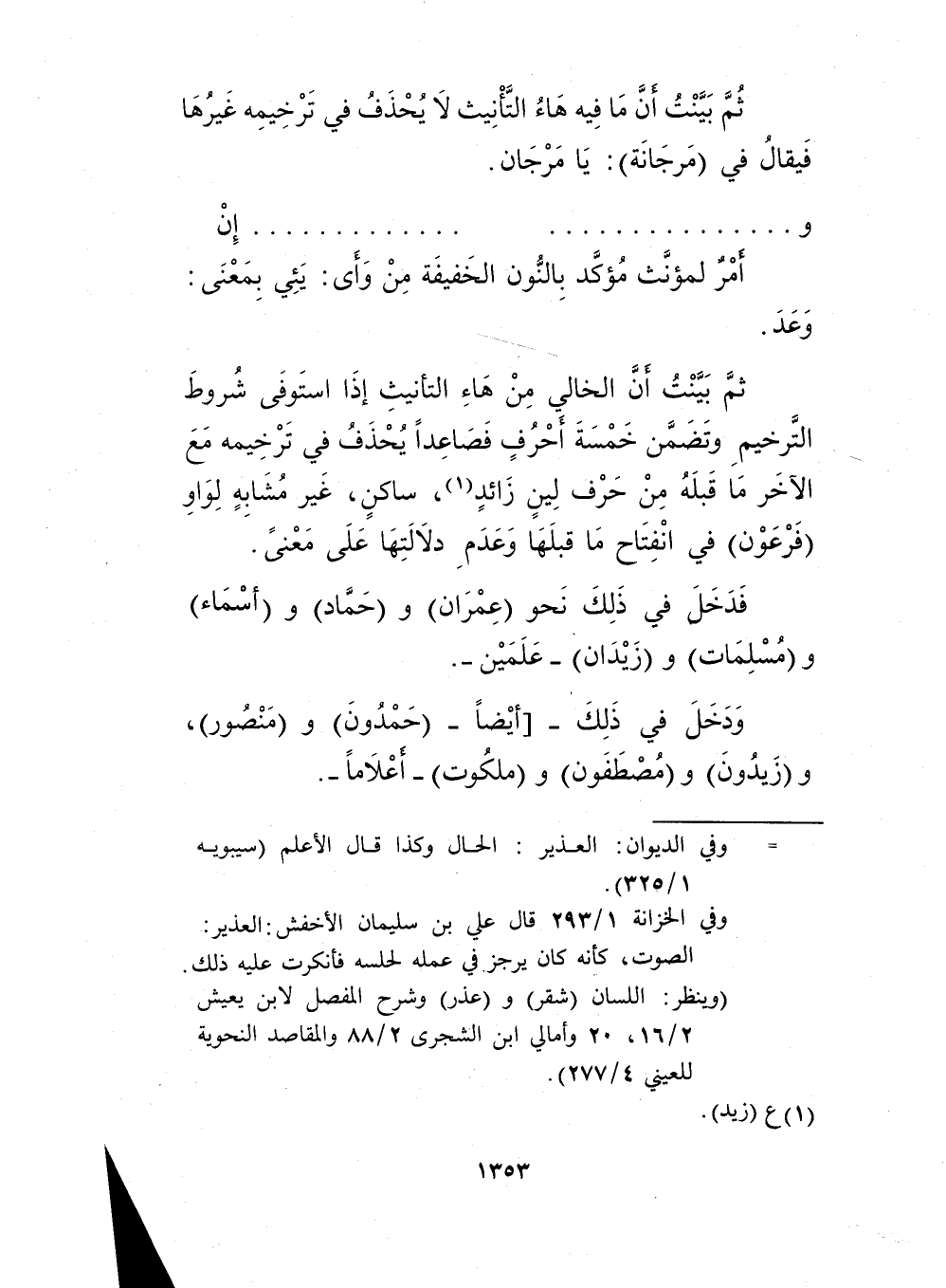 ثم بينت أن الخالي من هاء التأنيث إذا استوفى شروط الترخيم، وتضمن خمسة أحرف فصاعدا يحذف في ترخيمه مع الآخر ما قبله من حرف لين زائدٍ1، وساكن، وغير مشابه لواو "فرعون" في انفتاح ما قبلها، وعدم دلالتها على معنى.