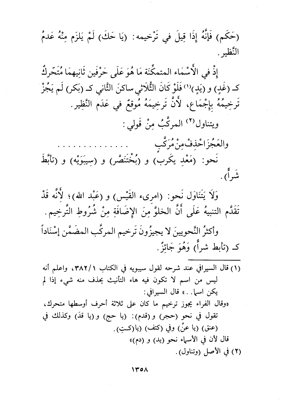 وأكثر النحويين لا يجيزون ترخيم المركب المضمن إسنادا كـ"تأبط شرا"، وهو جائز.