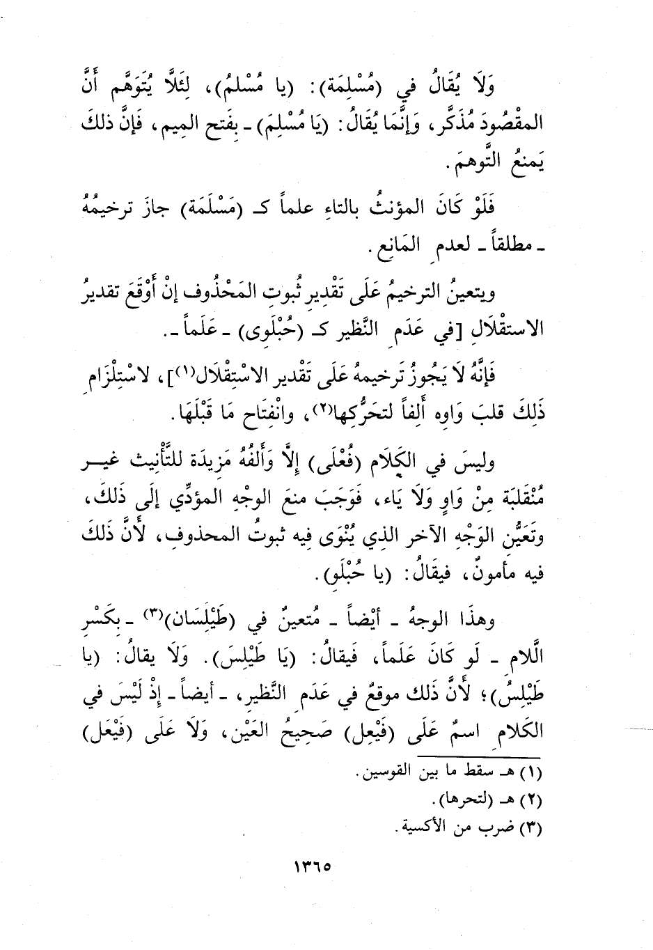 ولا يقال في "مسلمة": "يا مسلم"، لئلا يتوهم أن المقصود مذكر، وإنما يقال: "يا مسلم" -بتفح الميم، فإن ذلك يمنع التوهم.