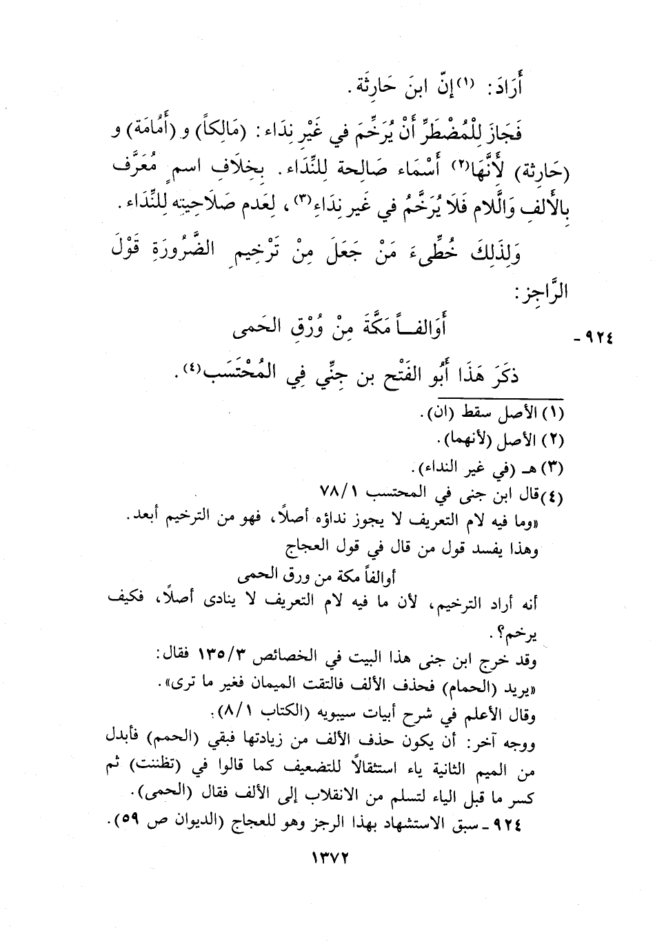 فجاز للمضطر أن يرخم في غير نداء: "مالكًا" و"أمامة" و"حارثة"؛ لأنها2 أسماء صالحة للنداء. بخلاف اسم عروف بالألف واللام، فلا يرخم في غير نداء3، لعدم صلاحيته للنداء.