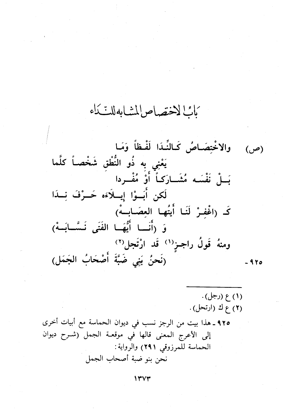 925- هذا بيت من الرجز نسب في ديوان الحماسة مع أبيات أخرى إلى الأعرج المعنى قالها في موقعة الجمل "شرح ديوان الحماسة للمرزوقي 291" والرواية:
