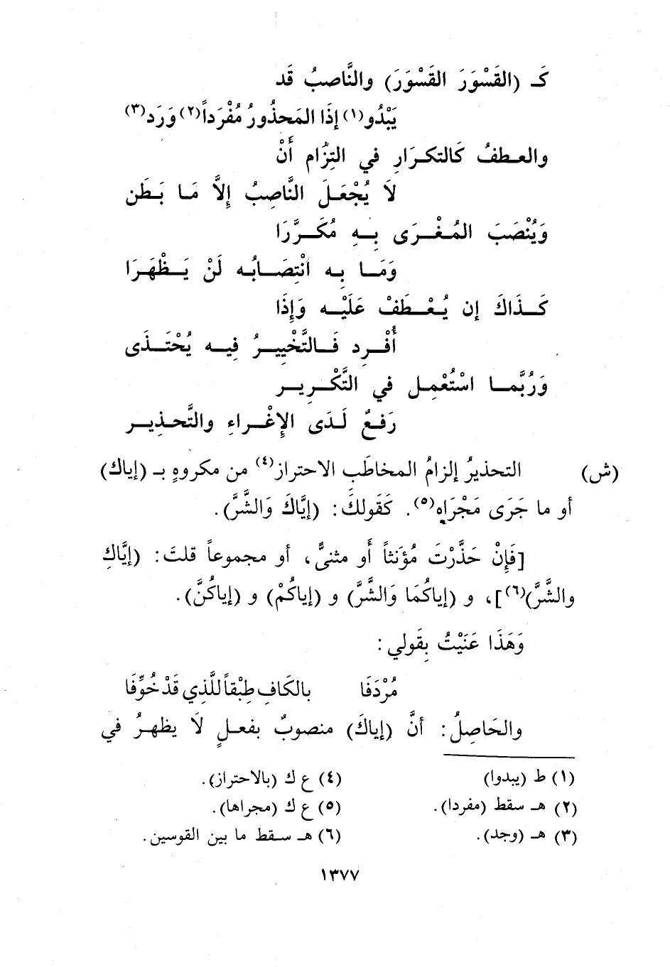 "ش" التحذير إلزام المخاطب الاحتزاز4 من مكروه بـ"إياك" أو ما جرى مجراه5. كقولك: "إياك والشر".
