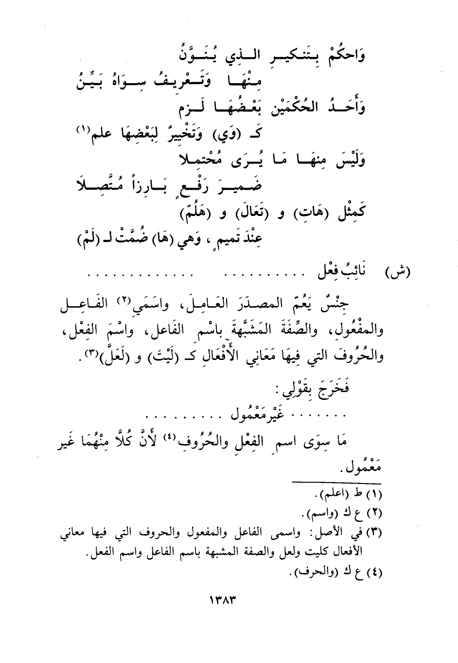 3 في الأصل: واسمي الفاعل والمفعول والحروف التي فيها معاني الأفعال كليت، ولعل والصفة المشبهة باسم الفاعل واسم الفعل.