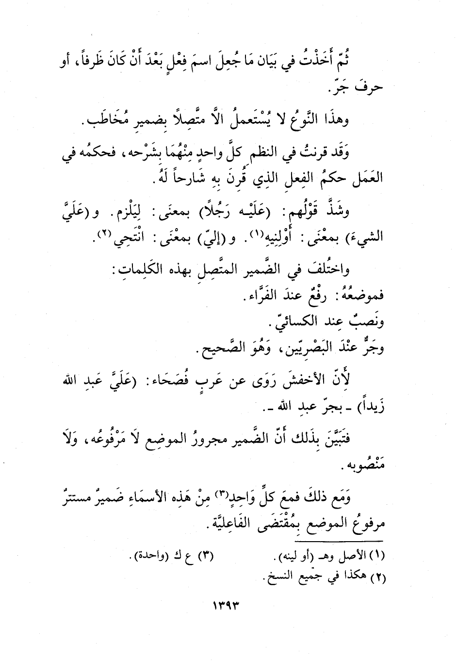فتبين بذلك أن الضمير مجرور الموضع لا مرفوعه، ولا منصوبه.