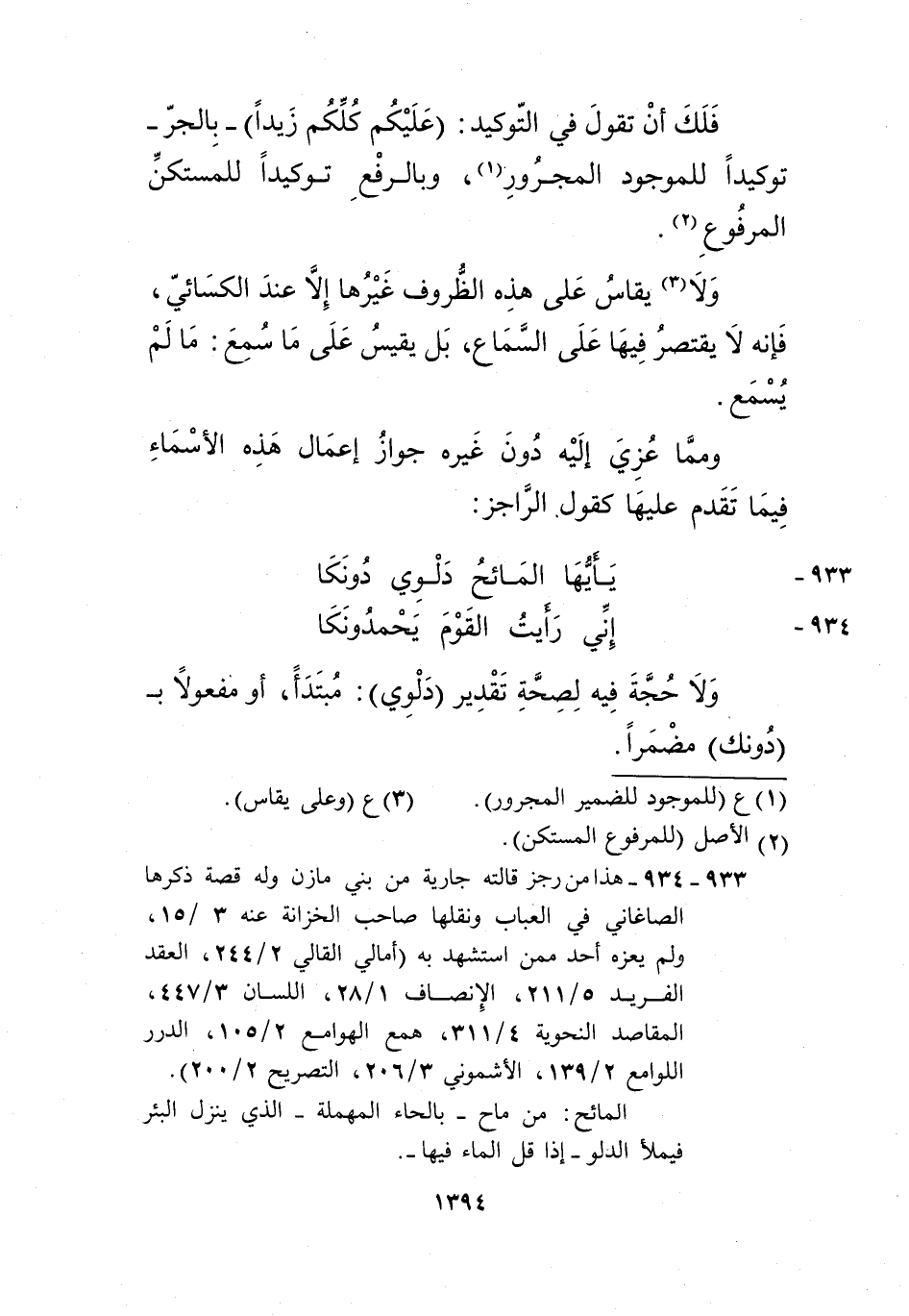 933-934- هذا من رجز قالته جارية مني بني مازن، وله قصة ذكرها الصاغاني في العباب ونقلها صاحب الخزانة عنه 3/ 15، ولم يعزه أحد ممن استشهد به "أمالي القالي 2/ 244، العقد الفريد 5/ 211، الإنصاف 1/ 28، اللسان 3/ 447، المقاصد النحوية 4/ 311، همع الهوامع 2/ 105، الدرر اللوامع 2/ 139، الأشموني 3/ 206، التصريح 2/ 200".