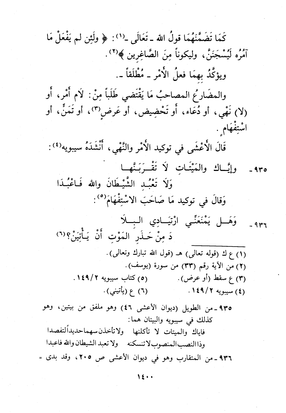 935- من الطويل ديوان الأعشى 46"، وهو ملفق من بيتين، وهو كذلك في سيبويه والبيتان هما: