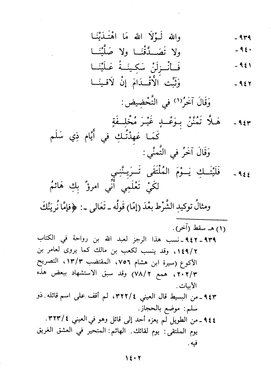 939-942- نسب هذا الرجز لعبد الله بن رواحة في الكتاب 2/ 149، وقد ينسب لكعب بن مالك كما يروى لعامر بن الأكوع "سيرة ابن هشام 756، المقتضب 3/ 13، التصريح 3/ 202، همع 2/ 78"، وقد سبق الاستشهاد ببعض هذه الأبيات.