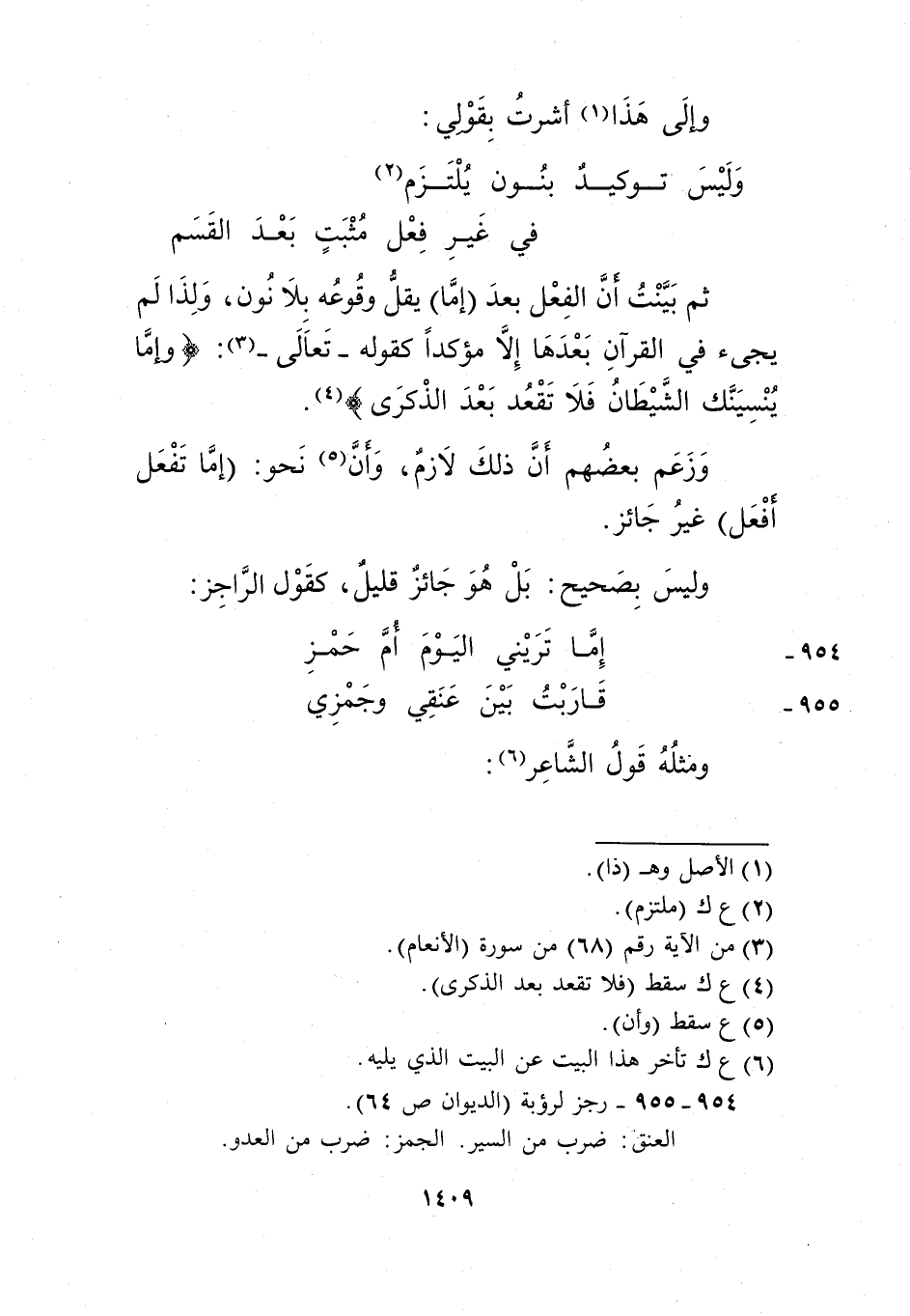 ثم بينت أن الفعل بعد "إما" يقل وقوعه بلا نون، ولذا لم يجئ في القرآن بعدها إلا مؤكدا كقوله تعالى3: {وَإِمَّا يُنْسِيَنَّكَ الشَّيْطَانُ فَلا تَقْعُدْ بَعْدَ الذِّكْرَى} 4.