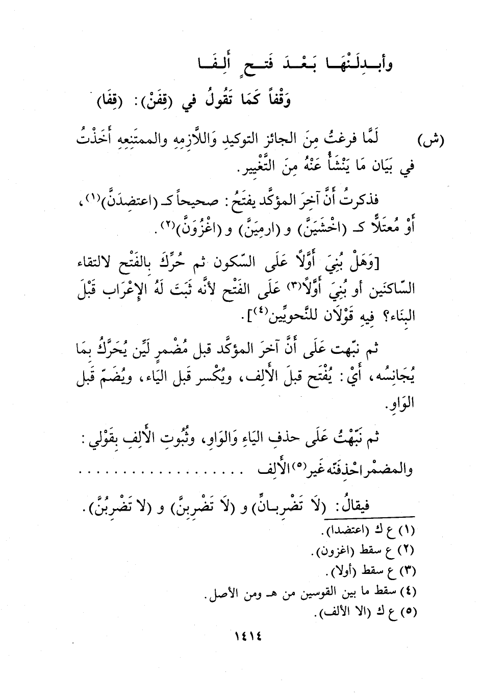 فذكرت أن آخر المؤكد يفتح: صحيحا كـ"اعتضدن"1، أو معتلا كـ"أخشين" و"ارمين" و"اغزون"2.