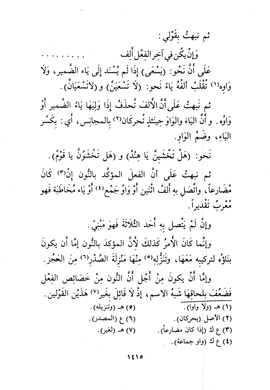ثم نبهت على أن الفعل المؤكد بالنون إن3 كان مضارعا، واتصل به ألف اثنين أو واو جمع4 أوياء مخاطبة فهو معرب تقديرًا.