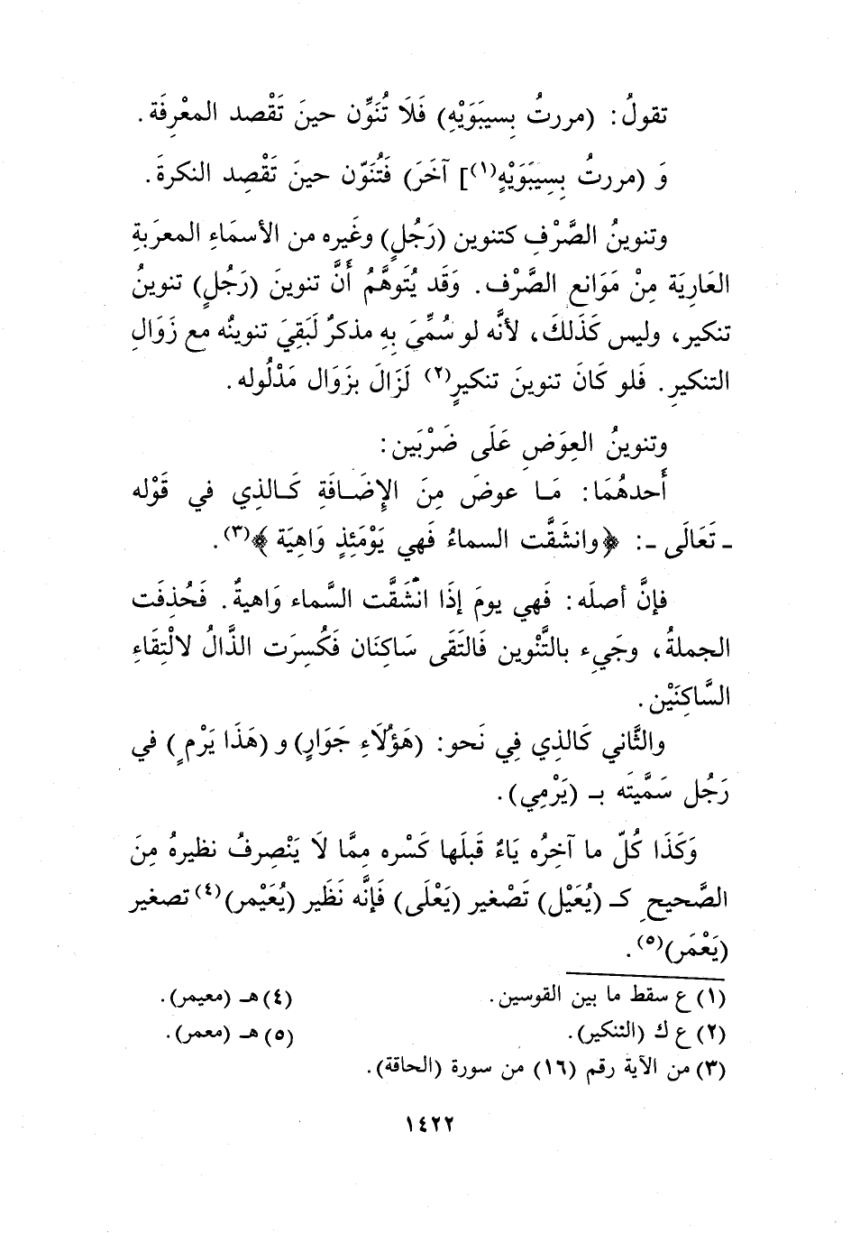 وتنوين الصرف كتنوين "رجل"، وغيره من الأسماء المعربة العارية من موانع الصرف. وقد يتوهم أن تنوين "رجل" تنوين تنكير، وليس كذلك؛ لأنه لو سمي به مذكر لبقي تنوينه مع زوال التنكير، فلو كان تنوين تنكير2 لزال بزوال مدلوله.