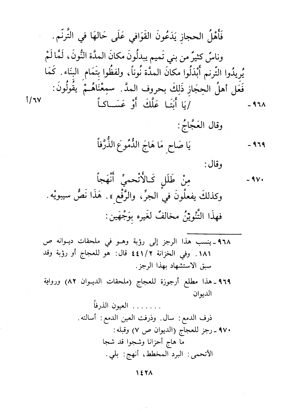 968- ينسب هذا الرجز إلى رؤبة، وهو في ملحقات ديوانه ص 181. وفي الخزانة 2/ 441 قال: هو للعجاج أو رؤبة وقد سبق الاستشهاد بهذا الرجز.