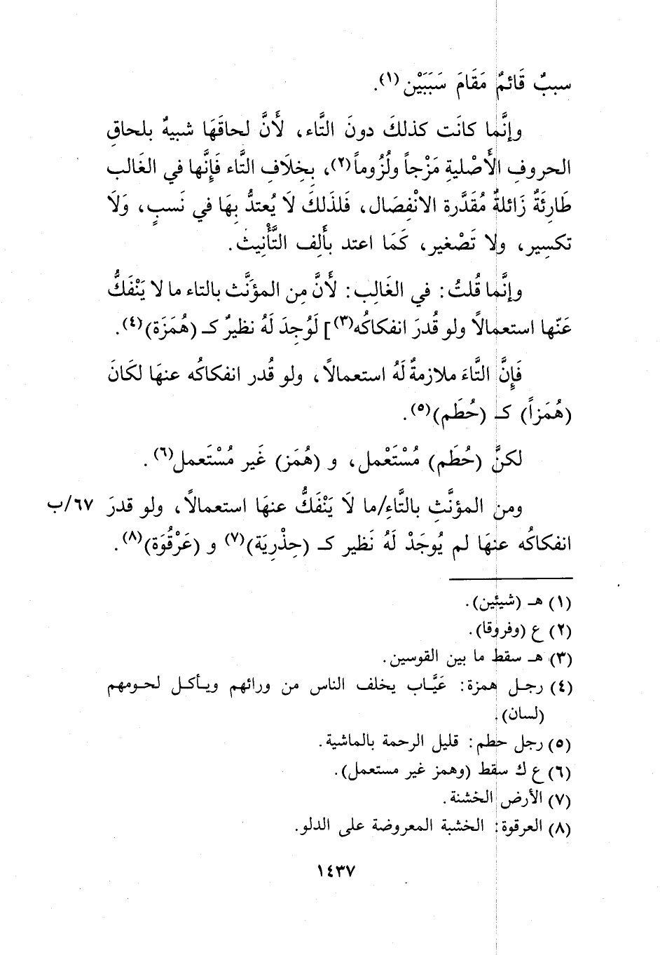 وإنما كانت كذلك دون التاء؛ لأن لحاقها شبيه بلحاق الحروف الأصلية مزجا ولزوما2، بخلاف التاء فإنها في الغالب طارئة زائلة مقدرة الانفصال، فلذلك لا يعتد بها في نسب، ولا تكسير، ولا تصغير، كما اعتد بألف التأنيث.