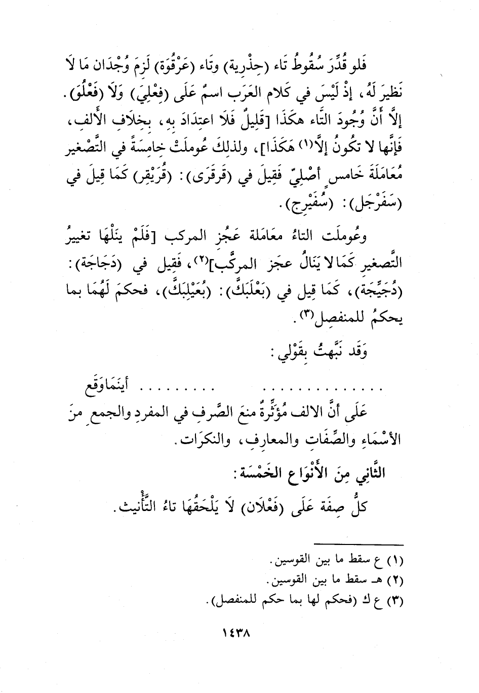 فلو قدر سقوط تاء "حذرية" وتاء "عرقوة" لزم وجدان ما لا نظير له، إذ ليس في كلام العرب اسم على "فعلي" ولا "فعلوا"، إلا أن وجود التاء هكذا [قليل فلا اعتداد به، بخلاف الألف، فإنها لا تكون إلا1 هكذا] . ولذلك عوملت خامسة في التصغير معاملة خامس أصلي فقيل في "قرقرى": "قريقر" كما قيل في "سفرجل": "سفيرج".