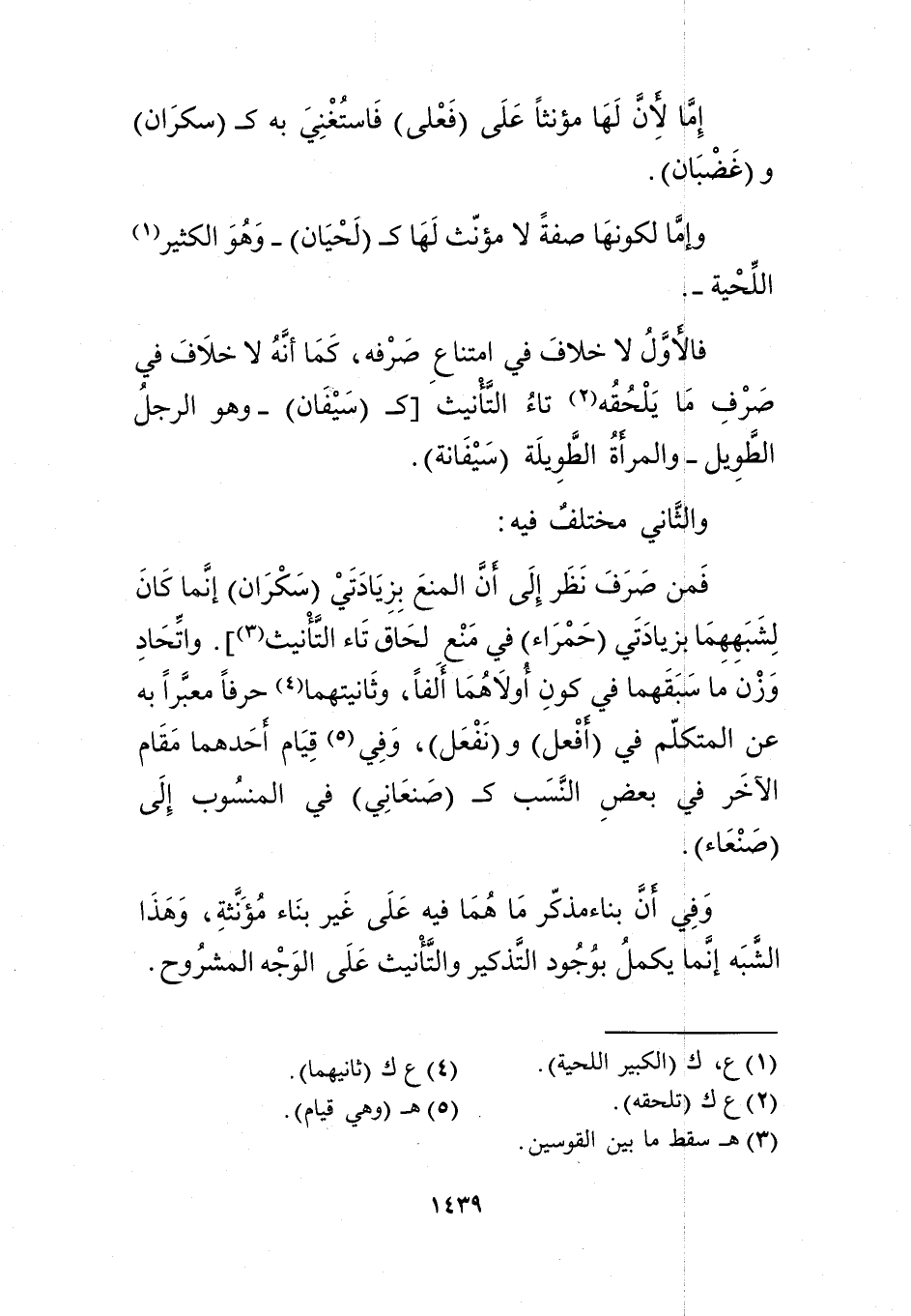 فمن صرف نظر إلى أن المنع بزيادتي "سكران"، إنما كان لشبههما بزيادتي "حمراء" في منع لحاق تاء التأنيث3] ، واتحاد وزن ما سبقهما في كون أولاهما ألفا، وثانيتهما4 حرفامعبرا به عن المتكلم في "أفعل" و"نفعل"، وفي5 قيام أحدهما مقام الآخر في بعض النسب كـ"صنعاني" في المنسوب إلى صنعاء.