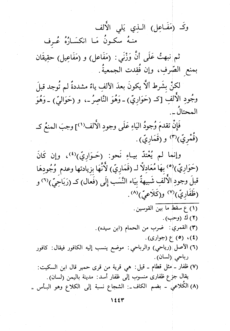 وإنما لم يعتد بياء نحو: "حواري"4، وإن كان "حواري"5 بها معدلا لـ" قماري"؛ لأنها بزيادتها وعدم وجودها قبل وجود الألف شبيهة بياء النسب إلى "فعال" كـ"رباحي"6 و "ظفاري"7 و"كلاعي"8.