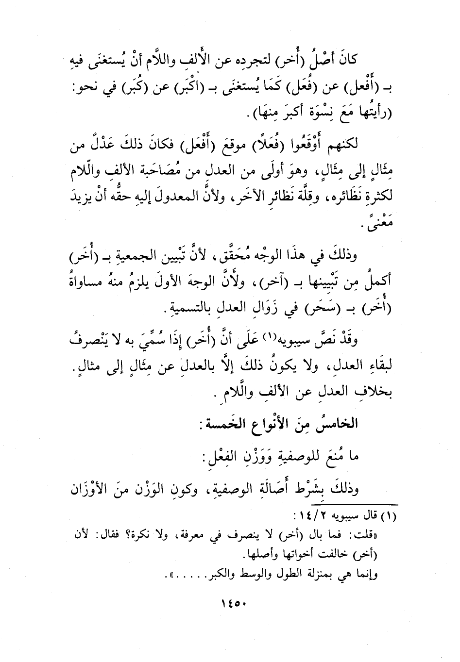وقد نص سيبويه1 على أن "أخر" إذا سمي به لا ينصرف لبقاء العدل، ولا يكون ذلك إلا بالعدل عن مثال إلى مثال. بخلاف العدل عن الألف واللام.