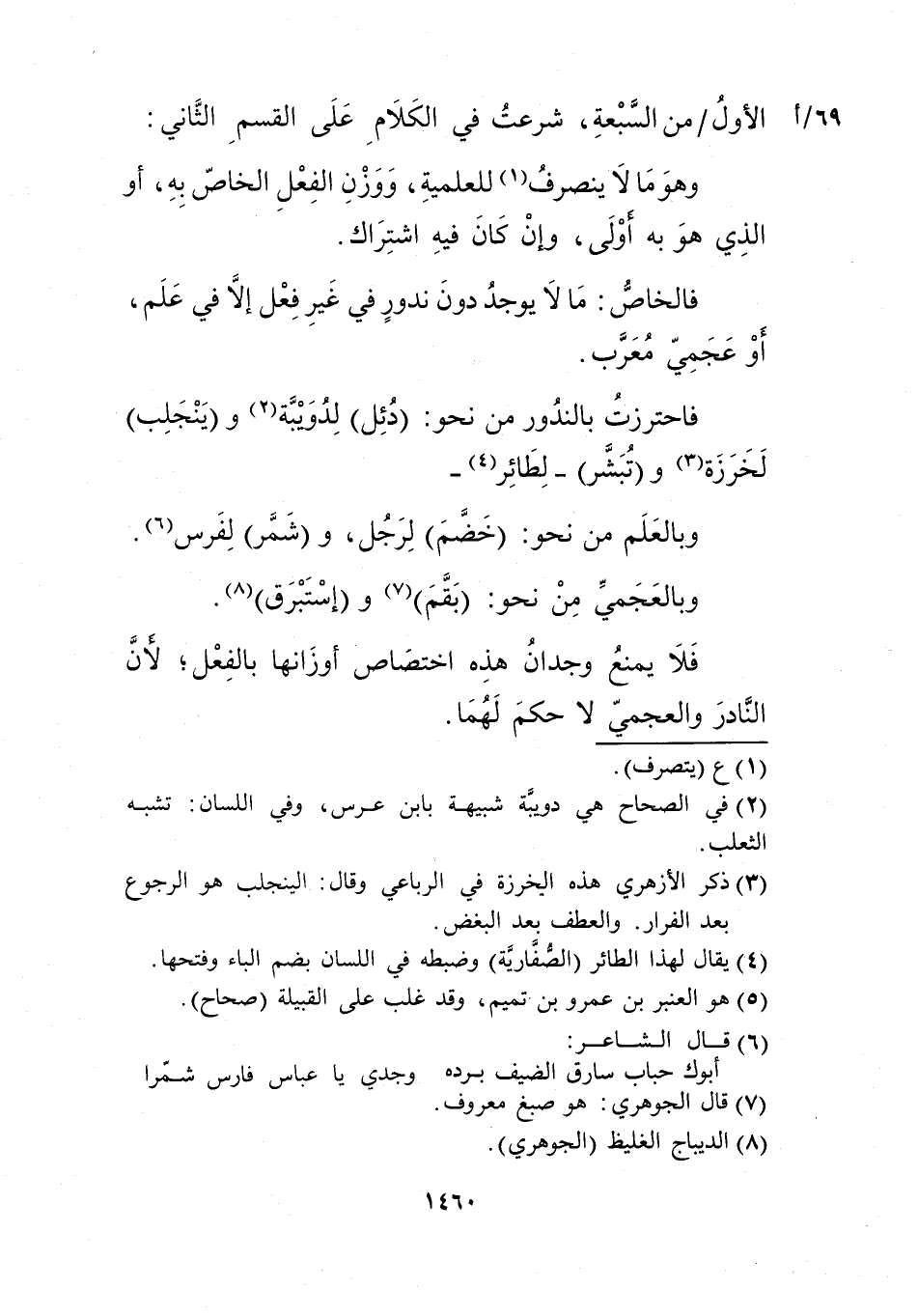 وبالعلم من نحو: "خضم" لرجل5، و"شمر" لفرس6، وبالعجمي من نحو: "بقم"7 و"استبرق"8.