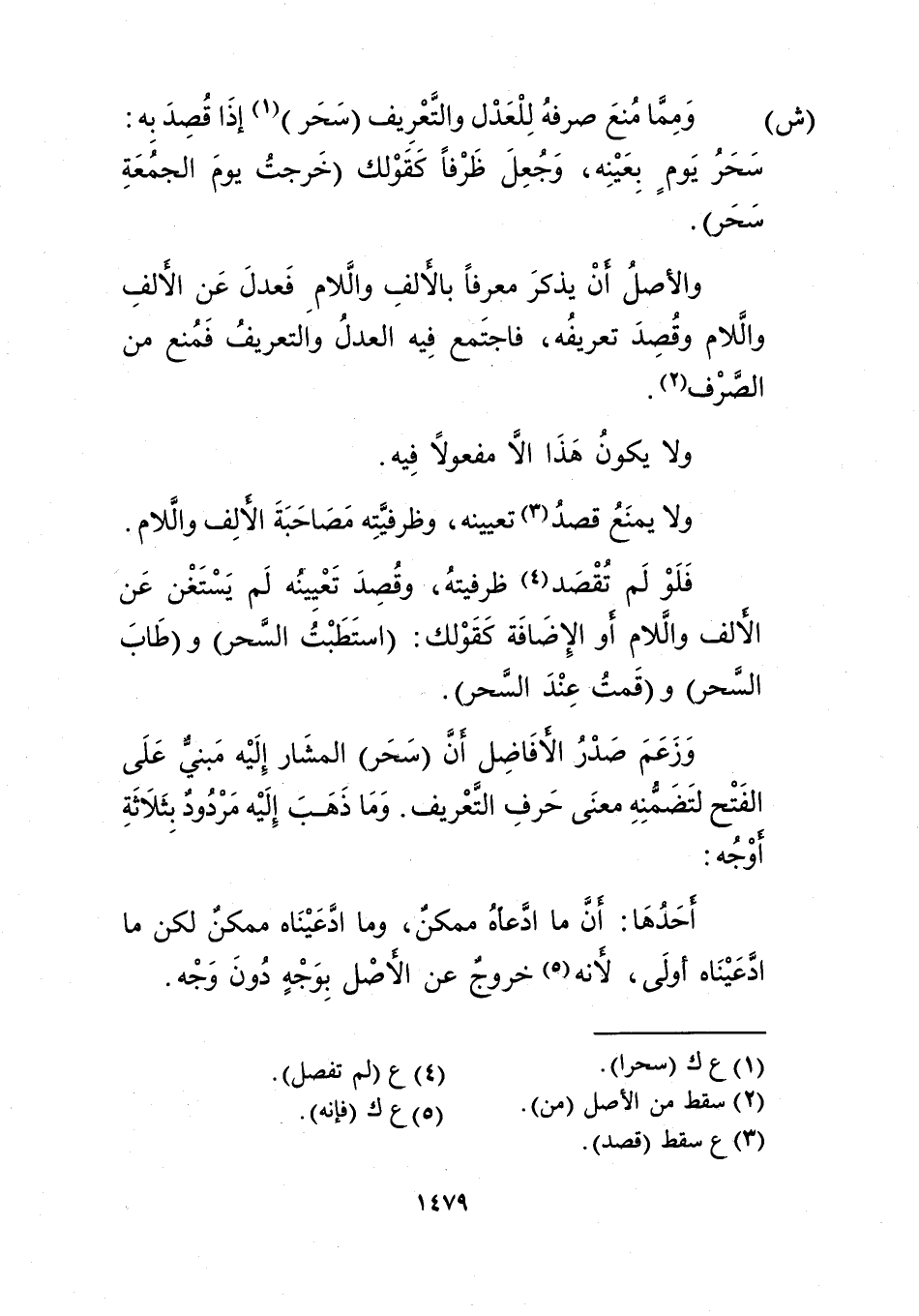 وزعم صدر الأفاضل أن "سحر" المشار إليه مبني على الفتح لتضمنه معنى حرف التعريف، وما ذهب إليه مردود بثلاثة أوجه: