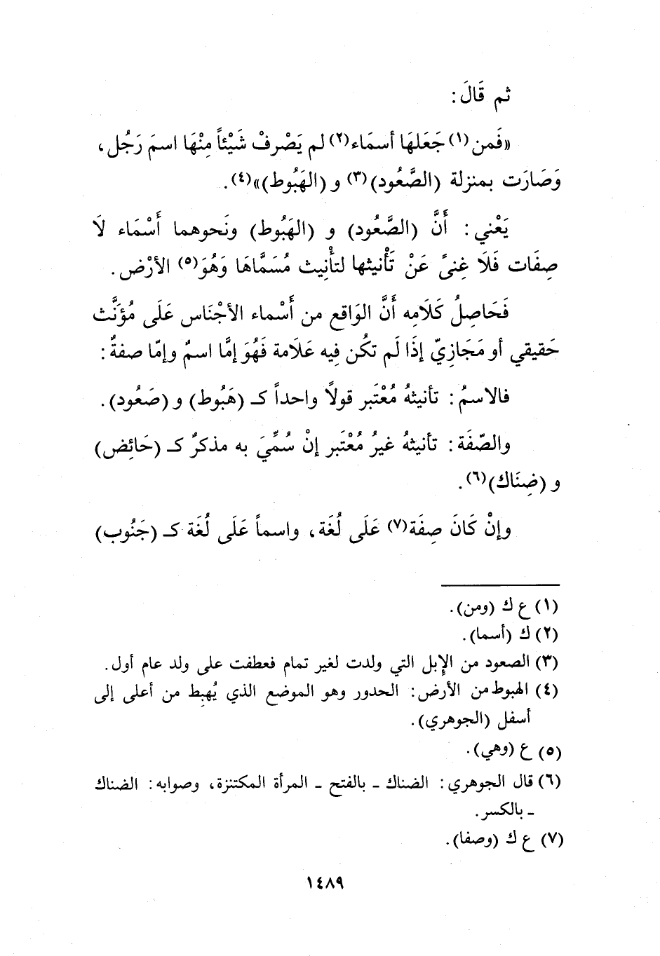يعني: أن "الصعود" و"الهبوط" ونحوهما أسماء لا صفات، فلا غنى عن تأنيثها لتأنيث مسماها وهو5 الأرض.