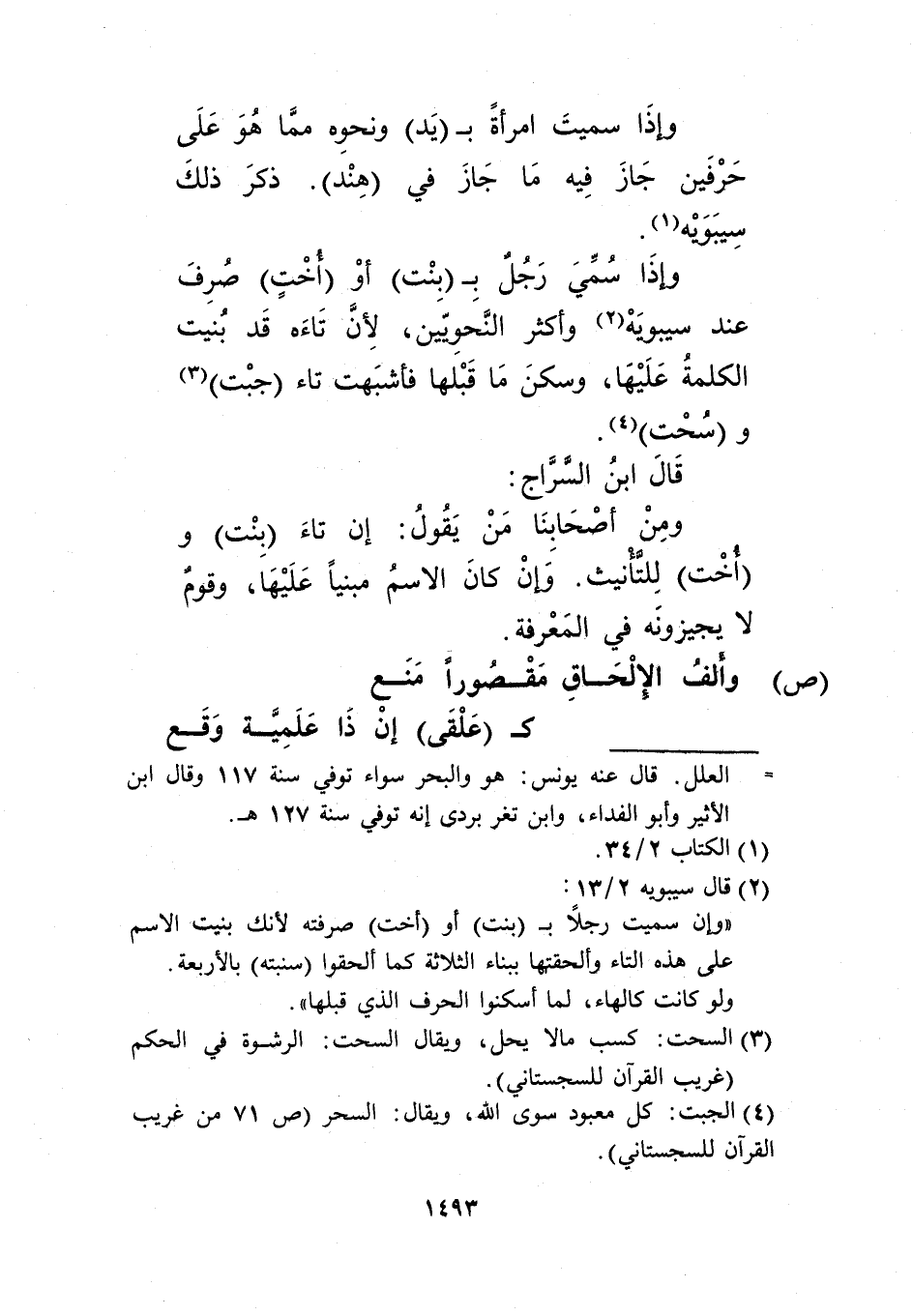 وغذا سمي رجل بـ"بنت" أو "أخت" صرف عند سيبويه2 وأكثر النحويين؛ لأن تاءه قد بنيت الكلمة عليها، وسكن ما قبلها فأشبهت تاء "جبت"3 و"سحت"4.
