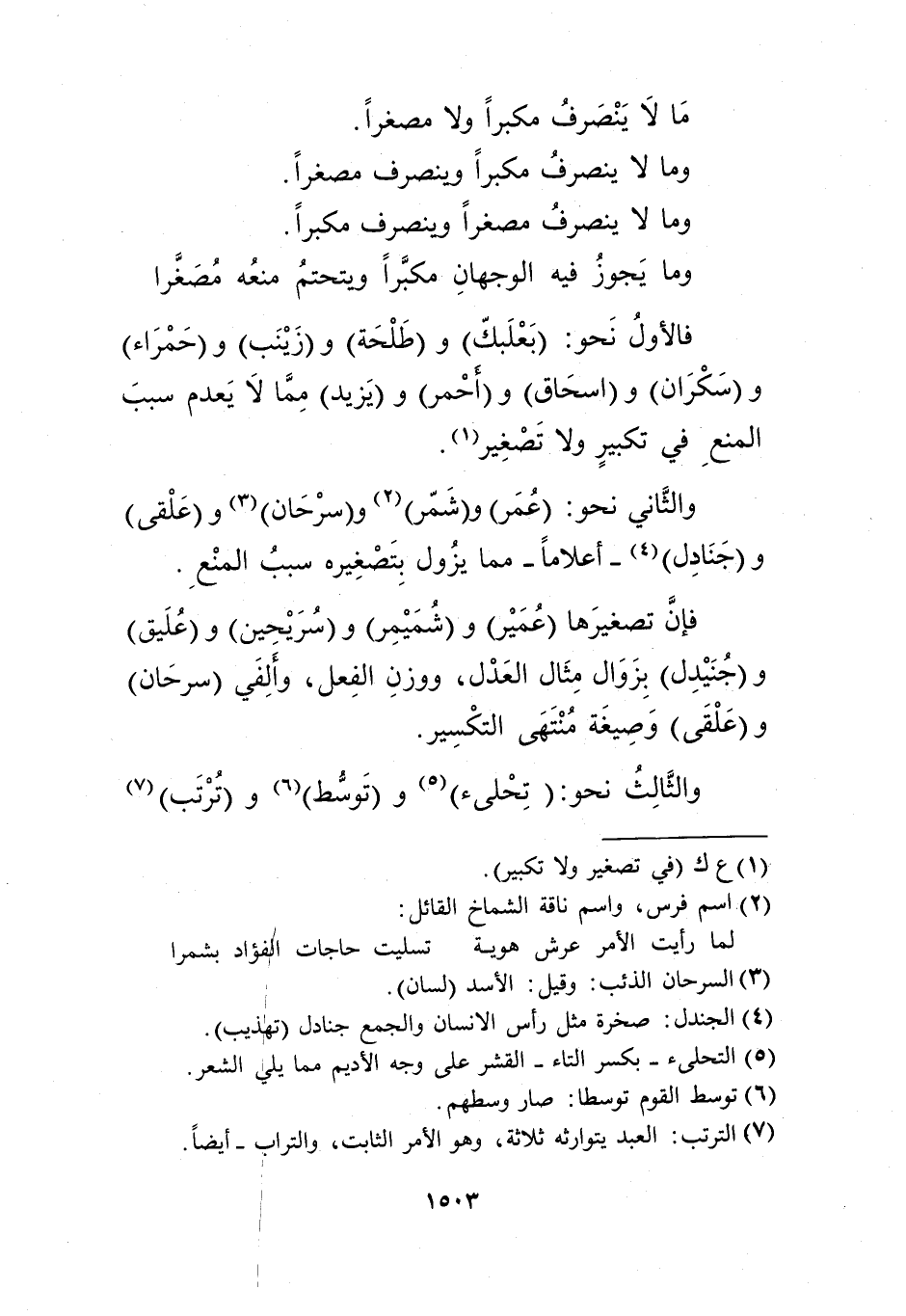 والثاني نحو: "عمر" و"شمر"2 و"سرحان"3 و"علقى" و"جنادل"4 -أعلاما- مما يزول بتصغيره سبب المنع.