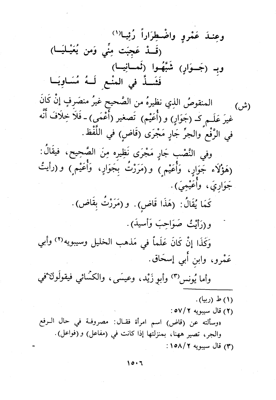 3 قال سيبويه 2/ 158: "ويقول يونس للمرأة تسمى بـ"قاض": مررت بقاضي قبل" و"مررت بأعيمي منك".