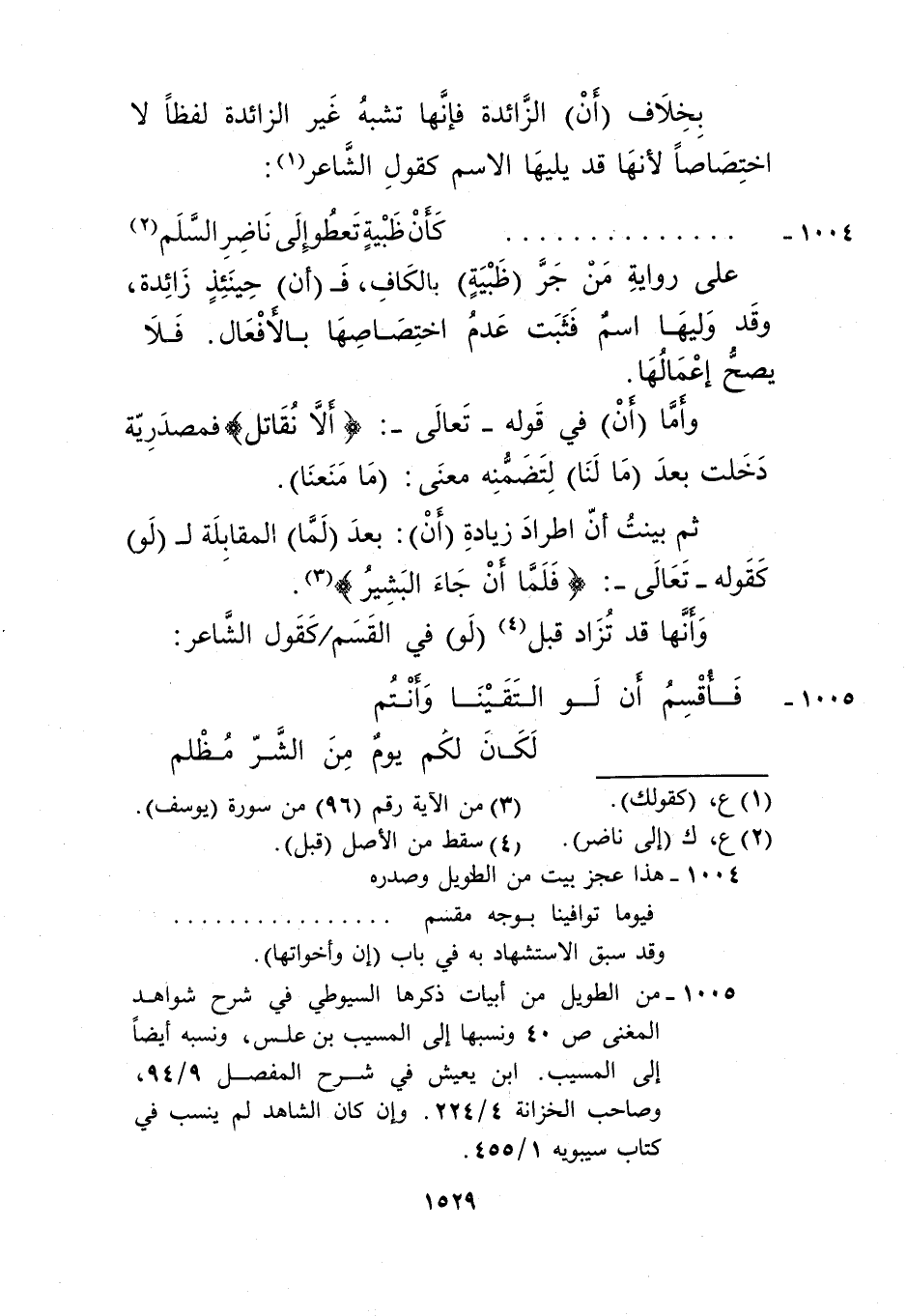 1005- من الطويل من أبيات ذكرها السيوطي في شرح شواهد المغني ص40، ونسبها إلى المسيب بن علس، ونسبة أيضا إلى المسيب، ابن يعيش في شرح المفصل 9/ 94، وصاحب الخزانة 4/ 224. إن كان الشاهد لم ينسب في كتاب سيبويه 1/ 455.