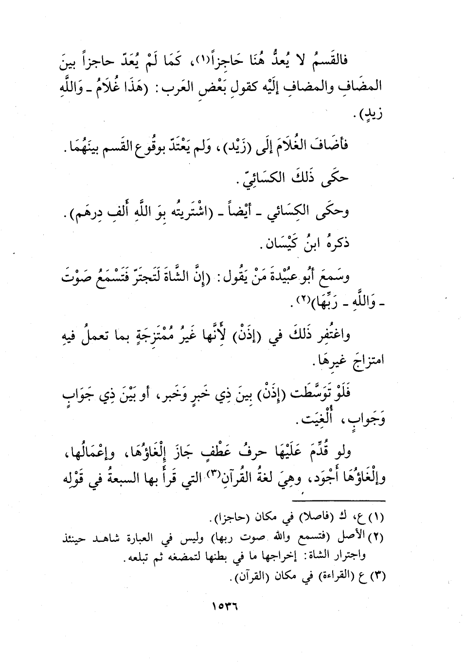 فالقسم لا يعد هنا حاجزا1، كما لم يعد حاجزا بين المضاف والمضاف إليه كقول بعض العرب: "هذا غلام -والله زيد".
