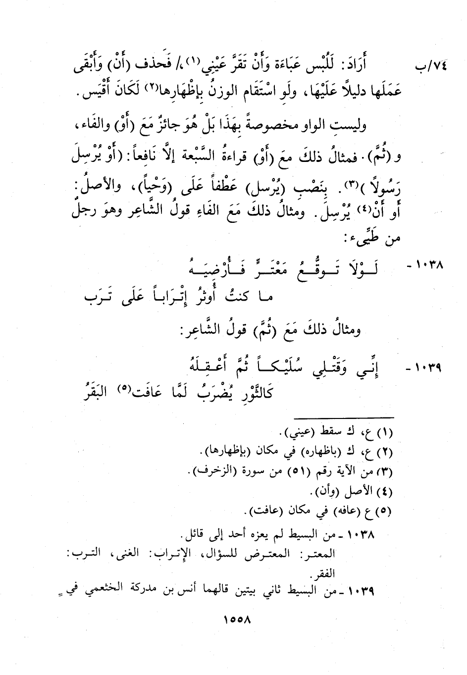 وليست الواو مخصوصة بهذا بل هو جائز "أو" والفاء، و"ثم"، فمثال ذلك مع "أو" قراءة السبعة إلا نافعا: "أو يرسل رسولا"3، بنصب "يرسل" عطفا على "وحيا"، والأصل: أو أن4 يرسل، ومثال ذلك مع الفاء قول الشاعر، وهو رجل من طيئ: