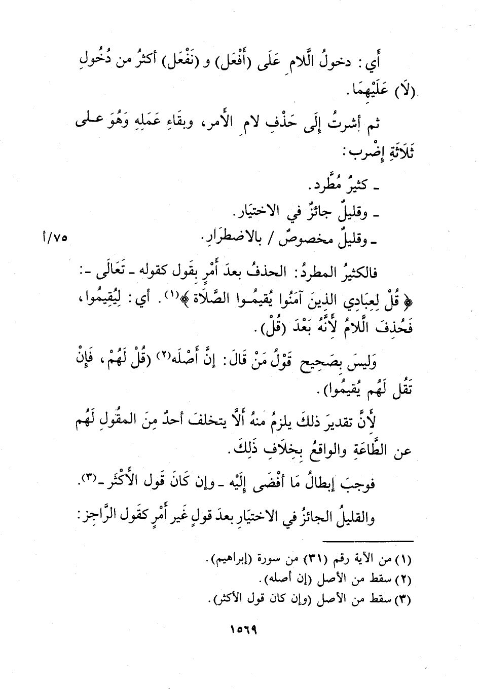 ثم أشرت إلى حذف لام الأمر، وبقاء عمله وهو على ثلاثة إضرب: