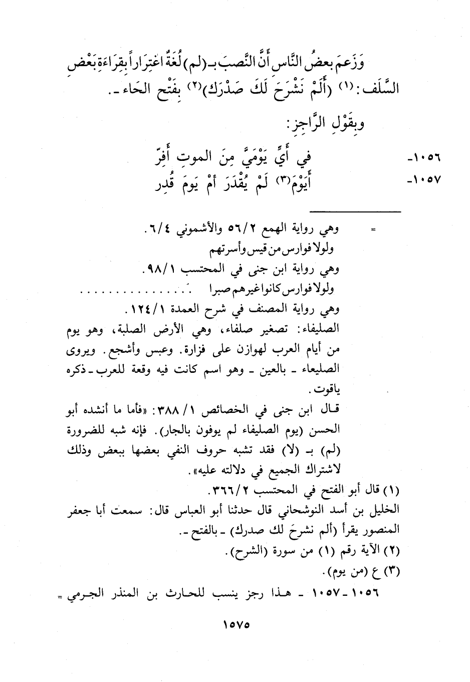 وزعم بعض الناس أن النصب بـ"لم" لغة اغترارا بقراءة بعض السلف: 1"ألم نَشْرَحَ لك صدرك"2 بفتح الحاء.
