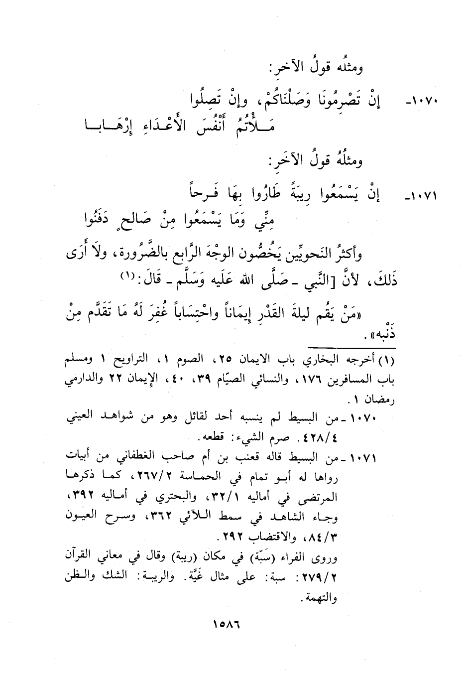 1071- من البسيط قاله قعنب بن أم صاحب الغطفاني من أبيات رواها له أبو تمام في الحماسة 2/ 267، كما ذكرها المرتضى في أماليه 1/ 32، والبحتري في أماليه 392، وجاء الشاهد في سمط اللآلي 362، وسرح العيون 3/ 84, والاقتضاب 292.