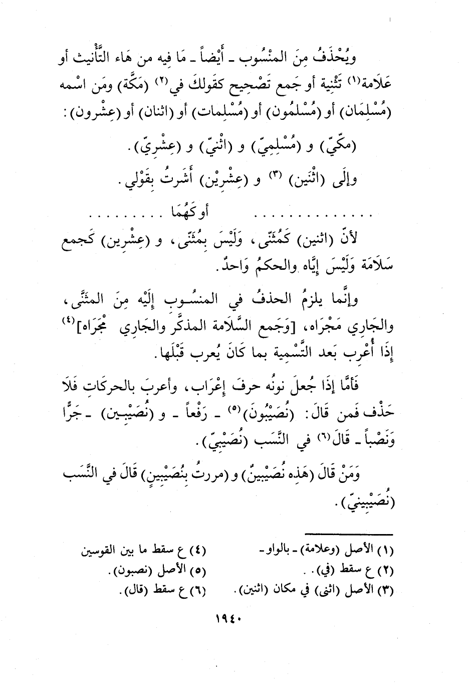 ويحذف من المنسوب -أيضًا- ما فيه من هاء التأنيث أو علامة1 تثنية أو جمع تصحيح كقولك في2 "مكة" ومن اسمه "مسلمان" أو "مسلمون" أو "مسلمات" أو "اثنان" أو "عشرون":